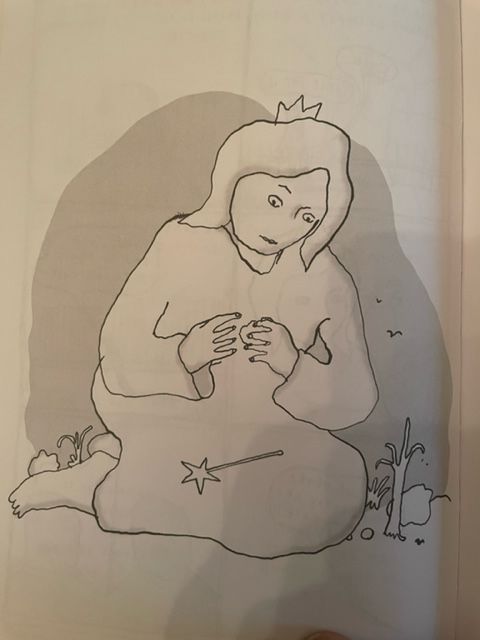 According to Finck, G-d wears a little crown, a diaphanous smock, and has a magic wand complete with a star at the end of it. She also looks very comfortable lounging around on the clouds.